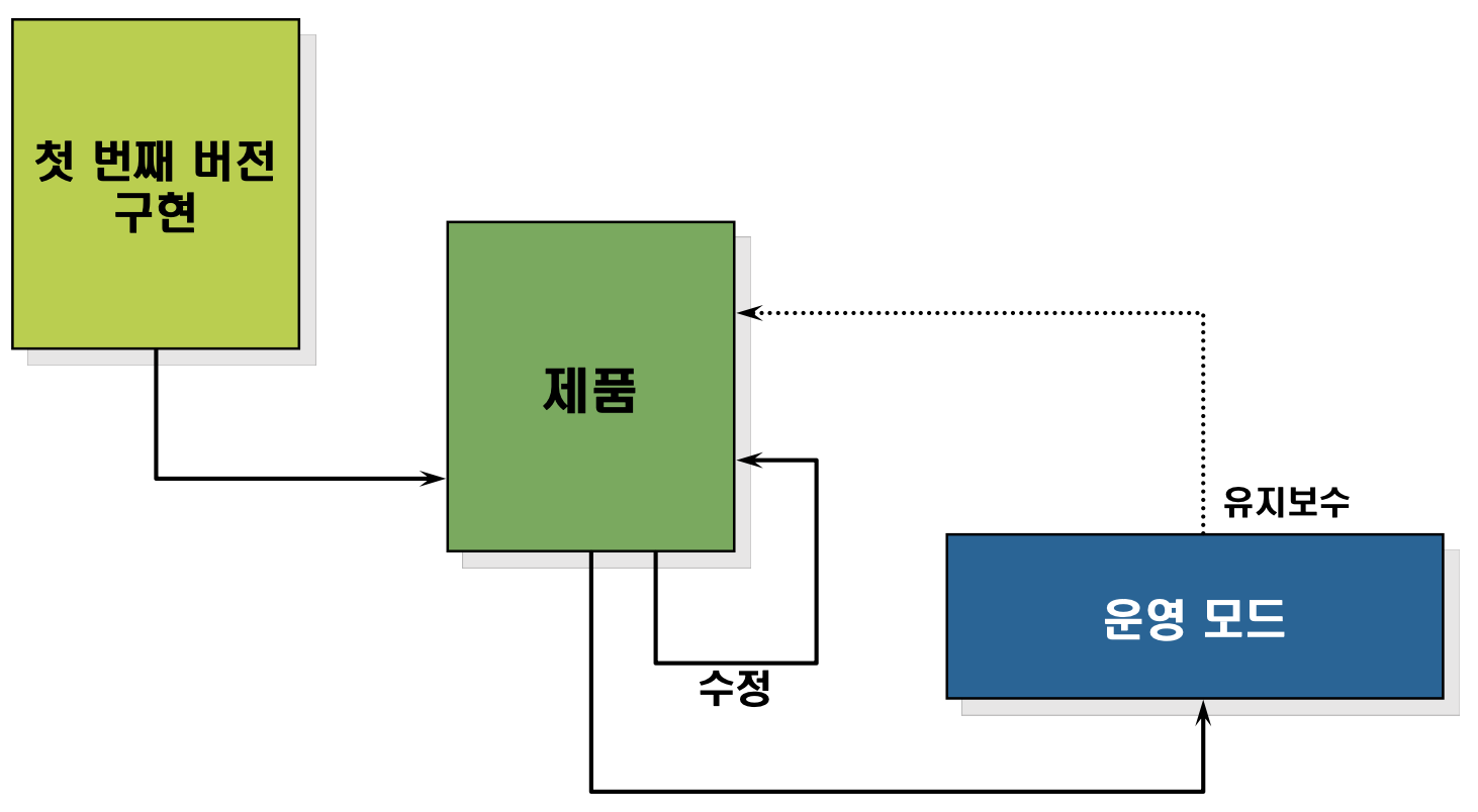 - 일단 코드를 작성하여 제품을 만들어본 후에 요구 분석, 설계, 유지보수에 대해 생각합니다.