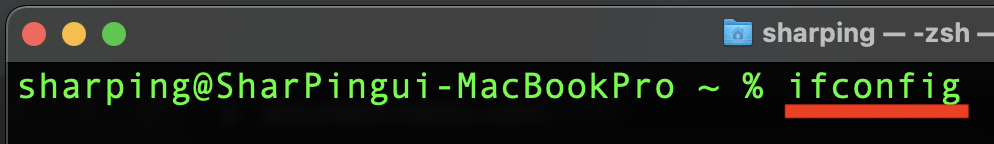 터미널(Terminal)를 열고 ifconfig 라고 입력합니다.