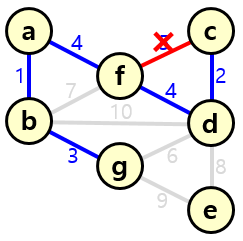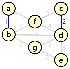 그 다음으로 적은 4를 잇습니다. 같은 비용인 간선이 2개 있을 때는 왼쪽 상단에 있는 것부터 잇도록 하겠습니다. (오른쪽에서부터 이어도 상관 없습니다)