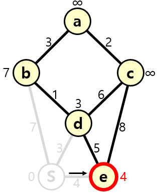 ∴ '포커스된 노드 값 + 간선 값 (4) < 발견된 노드 값 (∞)' 이 성립하므로 대체합니다.