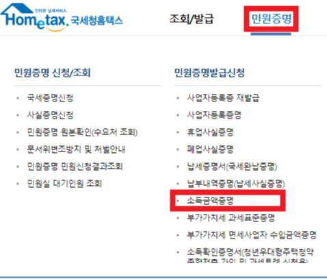 '민원증명' 메뉴를 클릭하고 '소득금액증명' 메뉴를 클릭합니다.