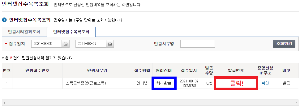파랑색으로 표시한 것과 같이 '처리 완료' 라고 뜨면 정상적으로 처리된 것입니다. 발급 번호를 클릭하면 출력 가능합니다.