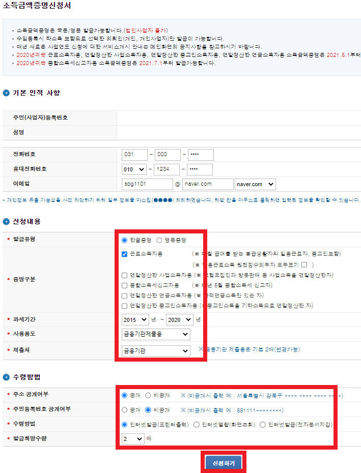 (2) 서류를 통해 증명하기 위한 내용이 무엇인지 잘 생각해서 선택하십시오. 예를 들어 6년 동안 근로자로 소득 활동 했다는 것을 증명한다면 증명구분은 근로소득자용, 과세기간은 6년(2015~2020)으로 하면 될 것입니다. 그런데 무엇을 어떻게 해야되는지 모르겠다면 제출 기관에 전화해서 직접 물어보는 것을 추천드립니다 ^^