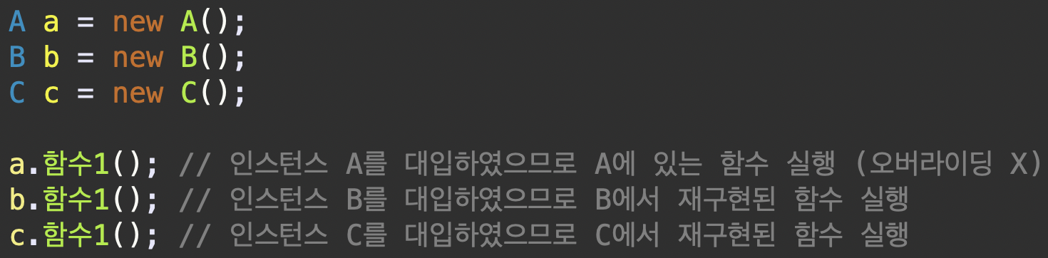 - 완전히 같은 두 함수가 슈퍼 클래스(부모 클래스)와 서브 클래스(자식 클래스)에 각각 있다고 이해하면 됩니다