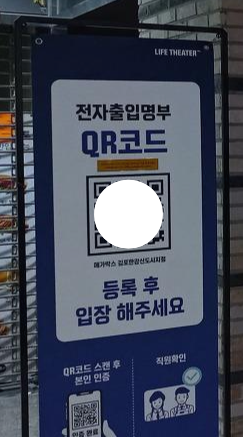 영화관 입장 시 위의 사진과 같은 간판이 있을 겁니다. 간판에 제시된 QR코드를 스캔합니다. 스캔할 때는 QR코드 인식 앱 아무거나 사용해도 됩니다.