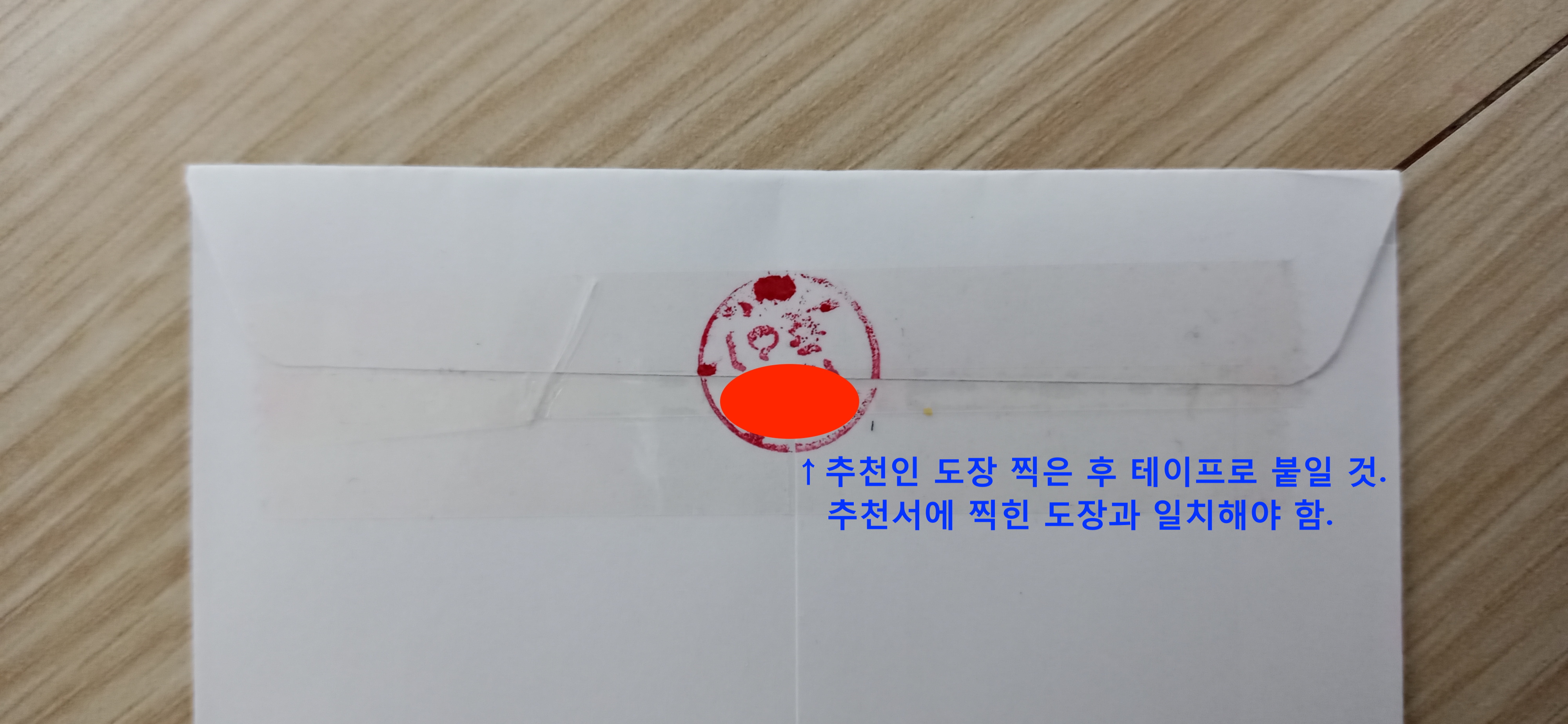 봉투 입구 가장자리에 추천인 도장을 한 번 더 찍고 테이프로 붙입니다. 이 때, 반드시 추천서에 찍힌 도장과 일치해야 합니다.