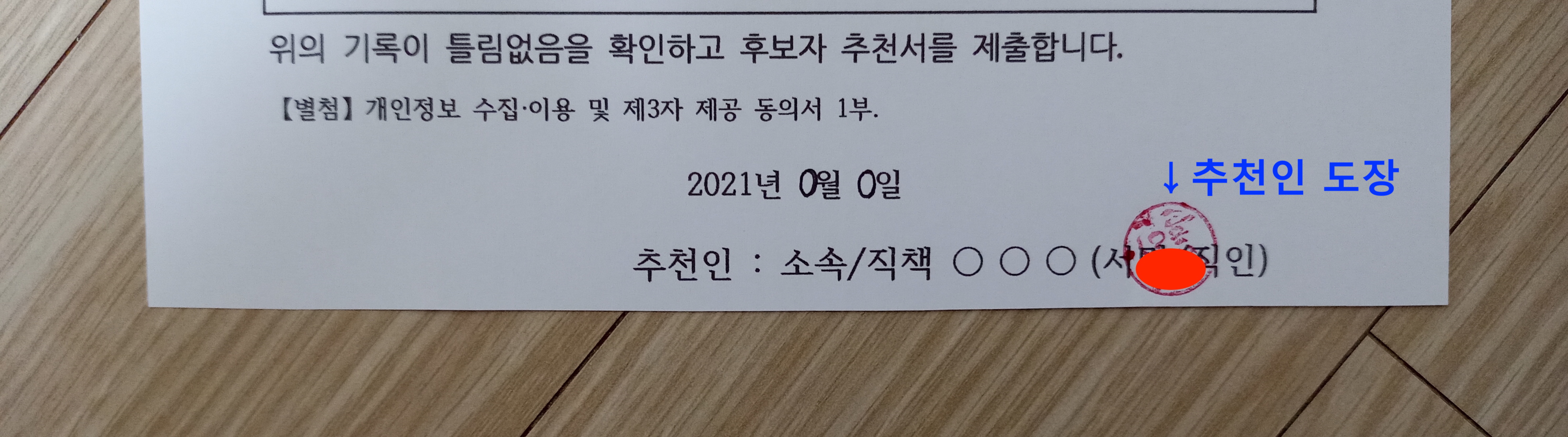 먼저 직인란에 추천인 도장을 찍은 후 추천서를 등기 봉투에 넣습니다.