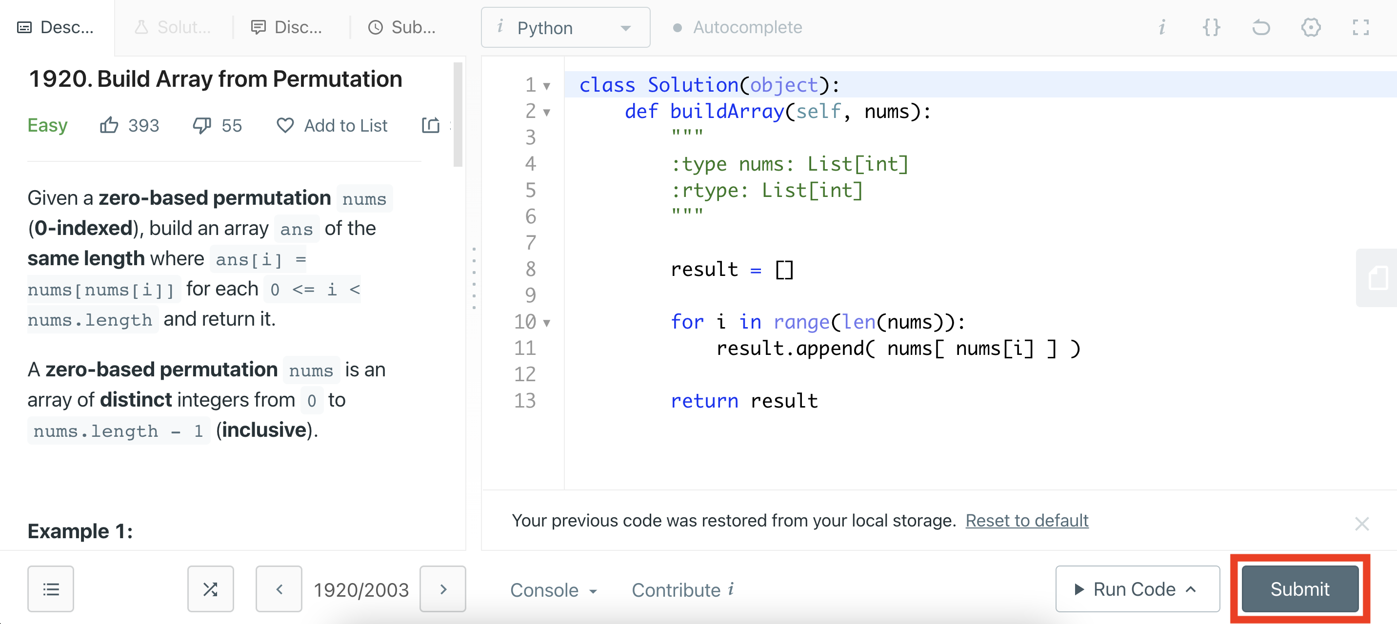 이 중 내가 풀고 싶은 문제를 고르면 됩니다. 저는 'Build Array from Permutation' 을 고르겠습니다.