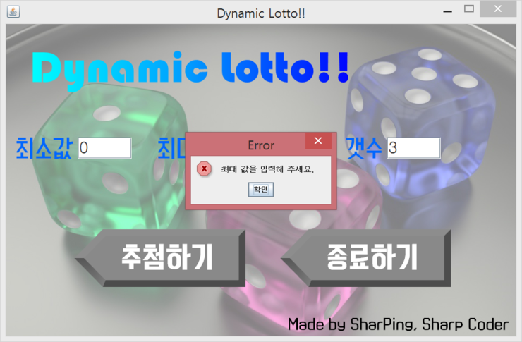 랜덤 넘버 추출 프로그램 입니다. 최소값, 최대값, 추첨 갯수를 모두 입력한 후 '추첨하기' 버튼을 클릭하면 랜덤 넘버가 나옵니다.