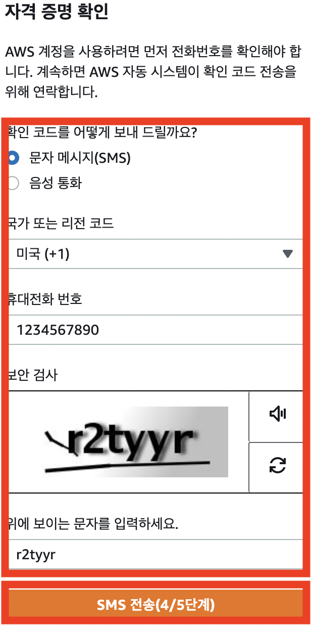모든 정보를 입력한 후 SMS 전송 버튼을 클릭하고 인증합니다.