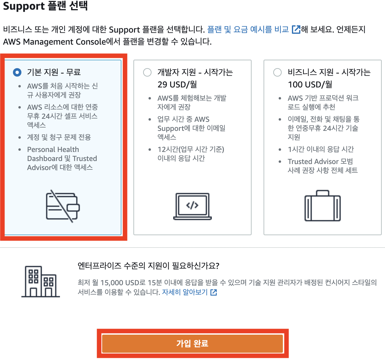 연습용으로 하는거라면 기본 지원을 선택하고 가입 완료 버튼을 클릭합니다.