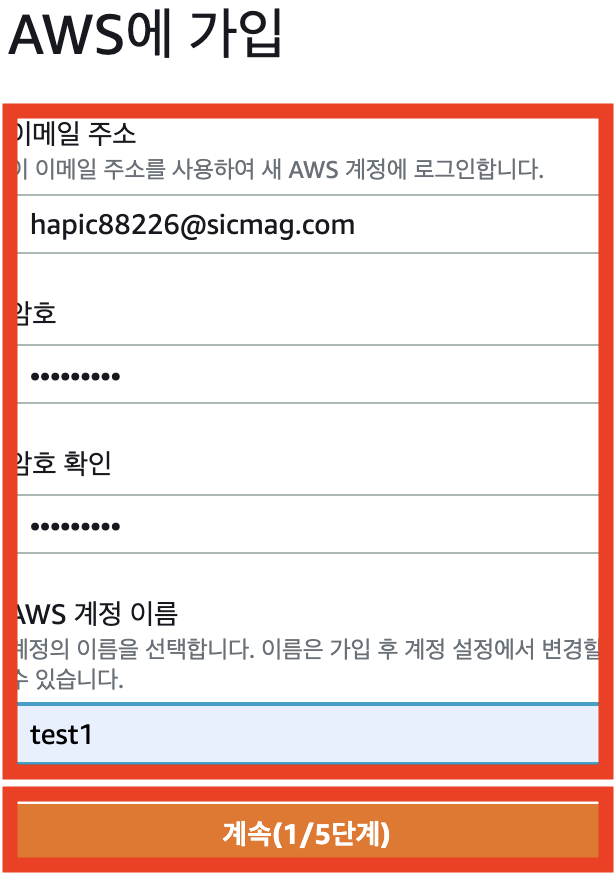 모든 정보를 입력한 후 확인 및 계속 버튼을 클릭합니다. 아쉽게도 AWS는 회원 가입 할 때부터 결제 정보를 입력해야 하고 해외 결제를 지원하는 신용카드 또는 체크카드가 있어야 합니다 ㅠ 만약 없으면 은행에 가서 하나 만들어야죠 뭐 ㅠㅠ
