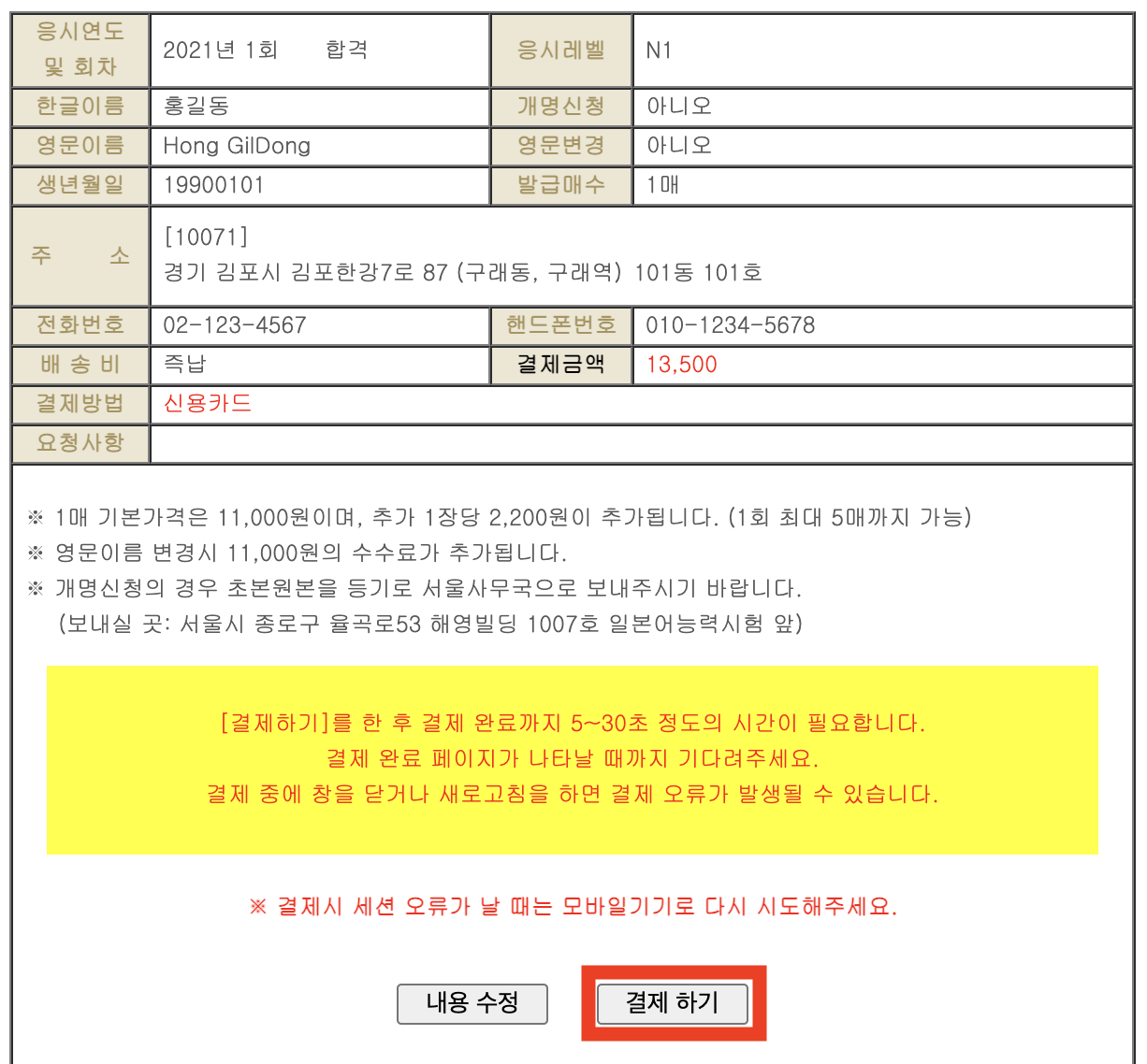 다시 확인하고 결제 하기 버튼을 클릭해서 결제하면 며칠 뒤 우편으로 받을 수 있습니다. 이 과정은 생략하겠습니다.