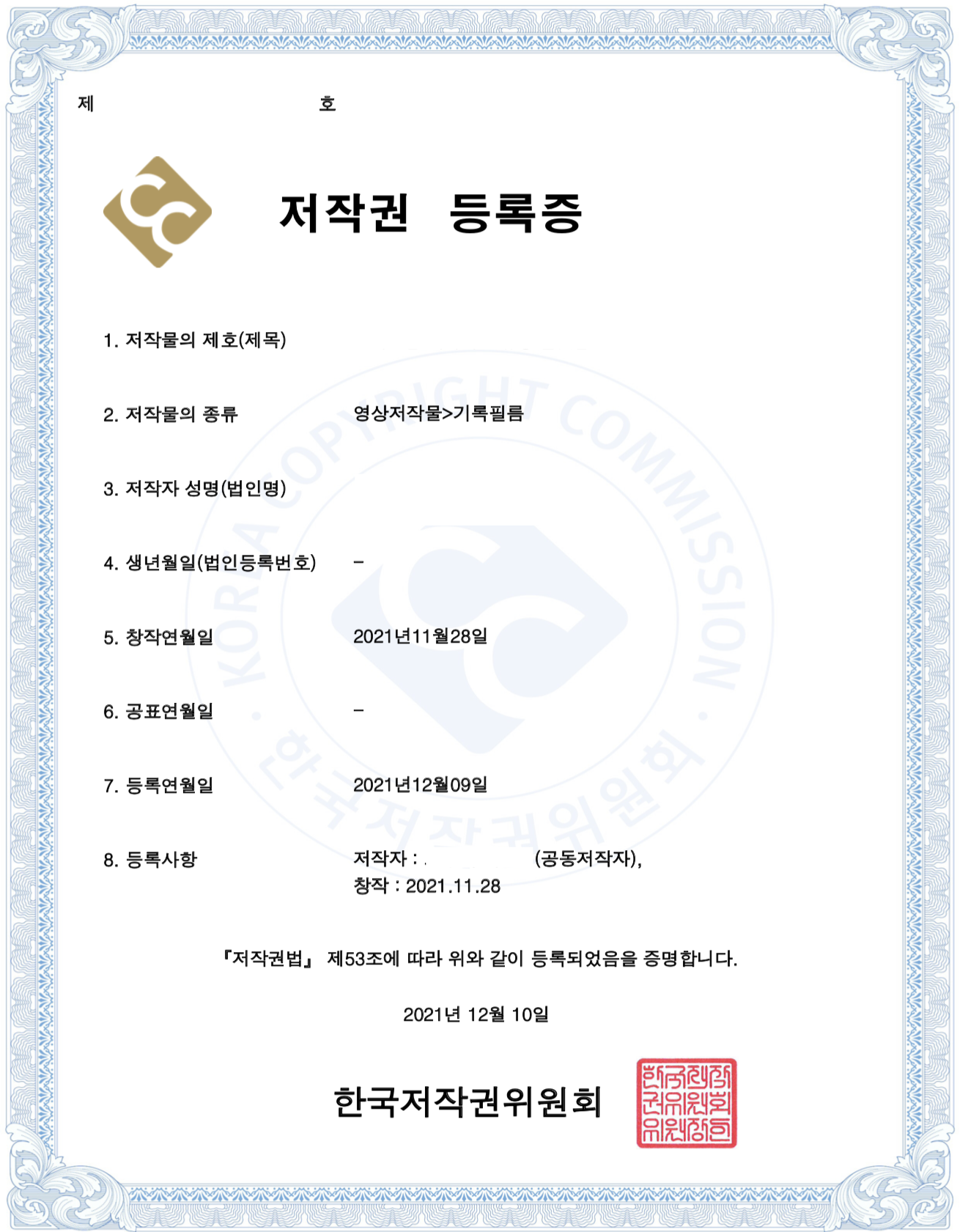저작권 등록 후 저작권 등록증이 나온 모습