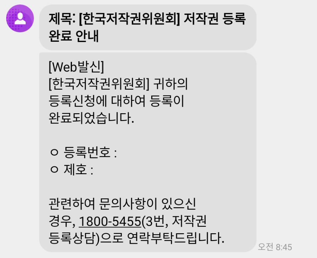 저작권 등록이 완료되면 문자가 옵니다.