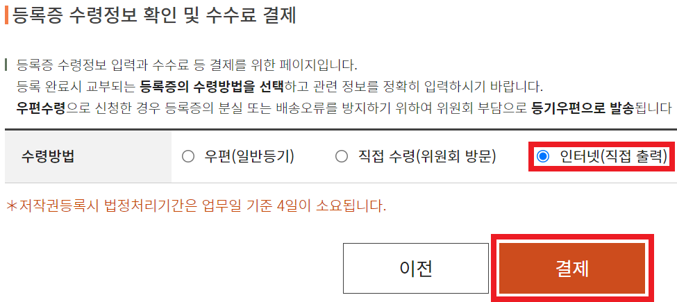 '인터넷(직접 출력)' 에 체크하고 결제 버튼을 클릭합니다. 결제 과정은 생략하겠습니다.