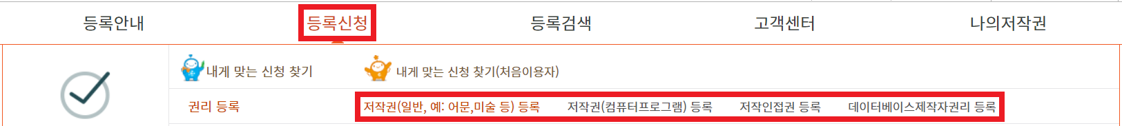 [등록신청] 메뉴를 클릭하고 저작권 등록할 상품의 종류에 따라 알맞은 메뉴를 클릭하면 됩니다. 저는 이미지를 등록할 것이므로 '저작권(일반, 예: 어문, 미술 등) 등록'을 클릭하겠습니다.
