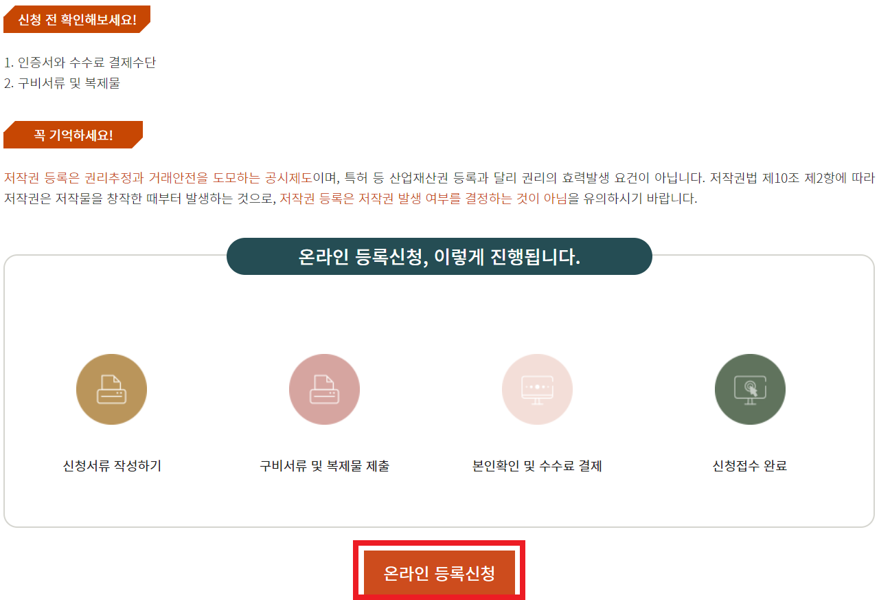 이번 시간에는 자기가 만든 상품을 저작권으로 등록하는 방법을 살펴보겠습니다. 조사 결과, 요즘 사람들도 많이 등록하는 것 같습니다. 물론 등록하지 않아도 상관없지만, 등록해놓으면 법적 분쟁에 서게 되었을 때 더 유리한 것 같습니다. (직접 경험한 건 아니라서 정확히 뭐가 더 유리한 건지는 모르겠습니다 ㅠㅠ)