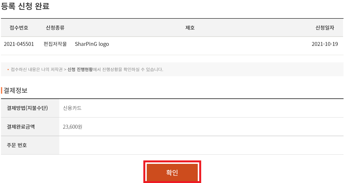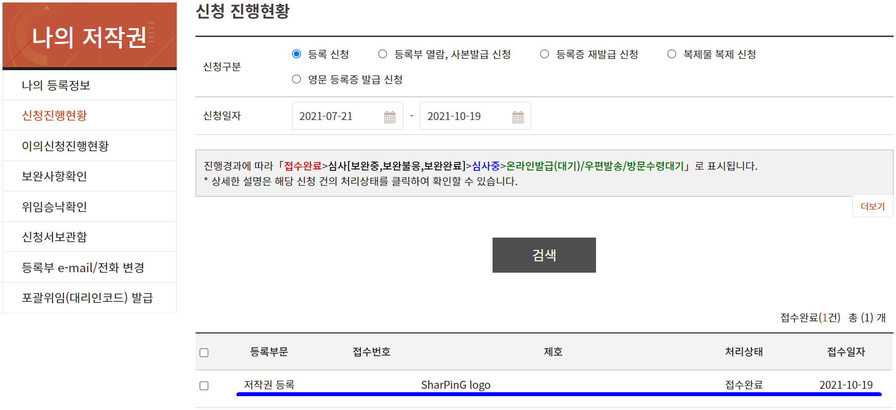 처리상태에 '접수완료'라고 뜬 것을 볼 수 있습니다. '온라인발급(대기)'으로 바뀌면 승인 후 저작권 등록이 됩니다.