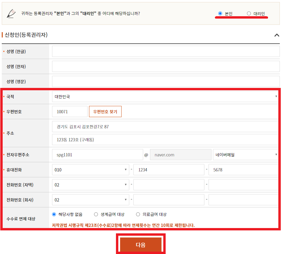 표시한 부분 모두 입력하고 다음 버튼 클릭합니다.