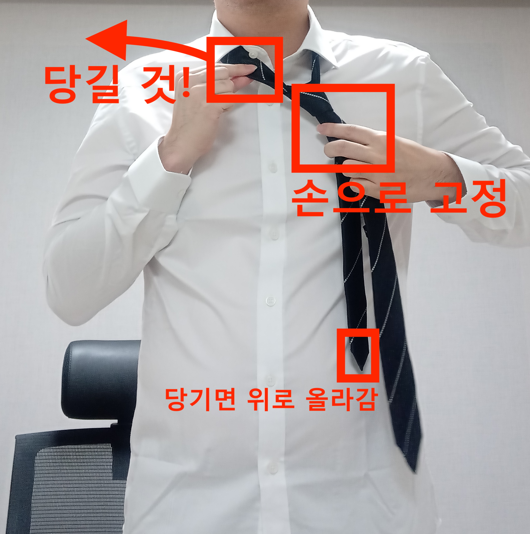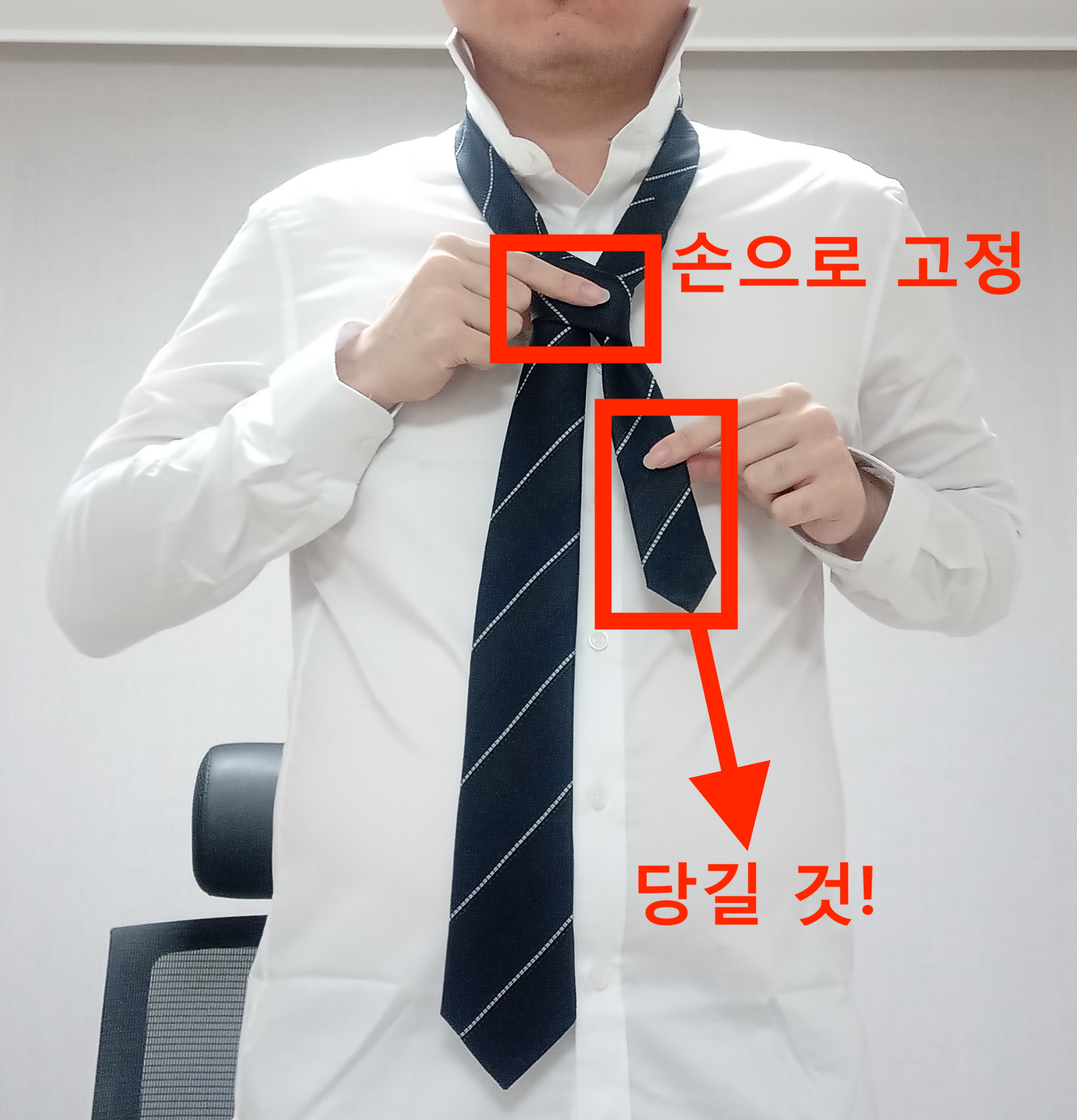 사진과 같이 중심부를 손으로 고정한 상태에서 목깃에 있는 넥타이 줄을 당깁니다. 이 때, 작은 모양이 위로 올라가야 합니다. 만약 올라가지 않는다면 반대쪽 넥타이 줄을 당깁니다. 이렇게 작은 모양이 빠져나올 때까지 계속 당기면 풀립니다!