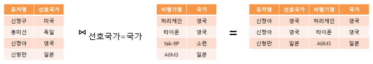 - 위의 이미지로 설명해보면, 왼쪽 테이블 내의 튜플들을 기준으로 오른쪽 테이블 내의 튜플들과 비교합니다. 비교해서 '선호국가'와 '국가'가 서로 같다면, 그 2개의 튜플을 서로 연결해서 결과로 제시합니다.
