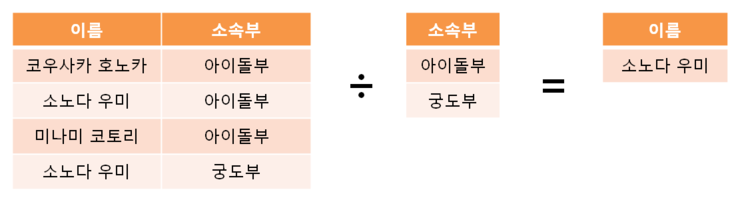 - 왼쪽 테이블을 기준으로 보았을 때, 오른쪽 테이블에 있는 값들을 모두 가지고 있는 튜플들만 남겨놓는 연산자입니다.