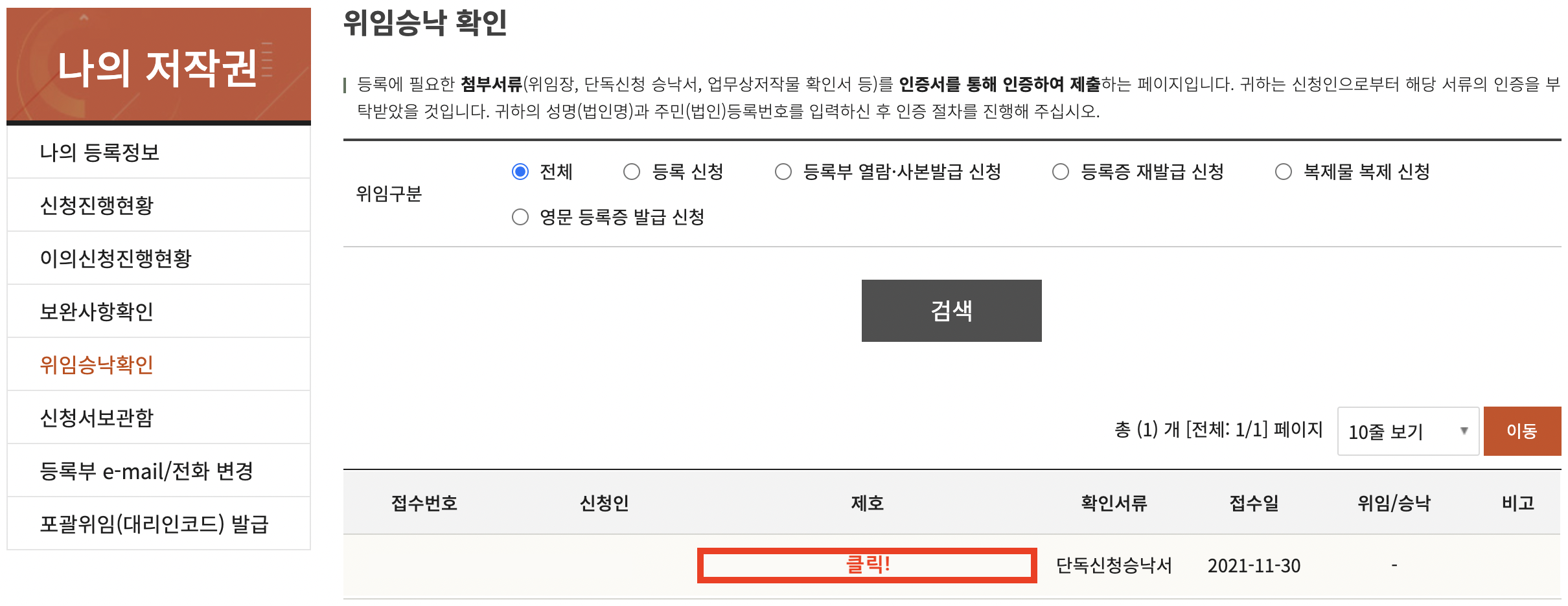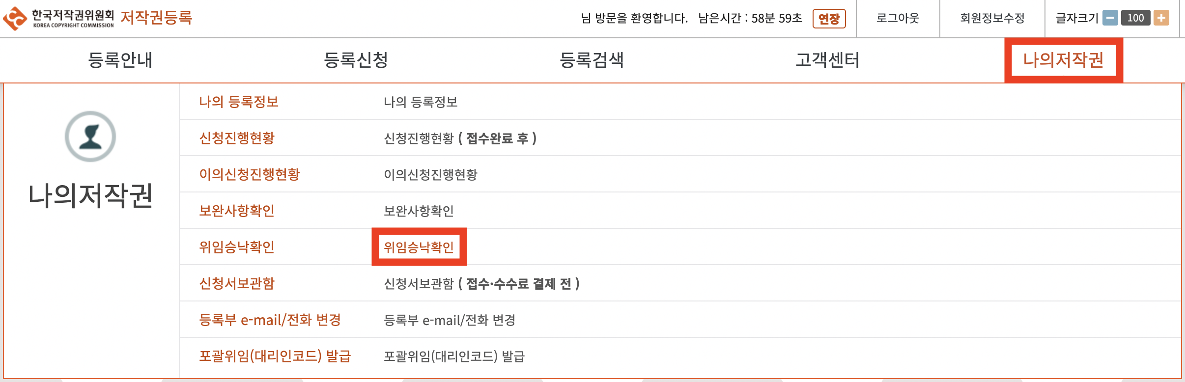 로그인 후 [나의저작권]-[위임승낙확인] 을 클릭합니다.