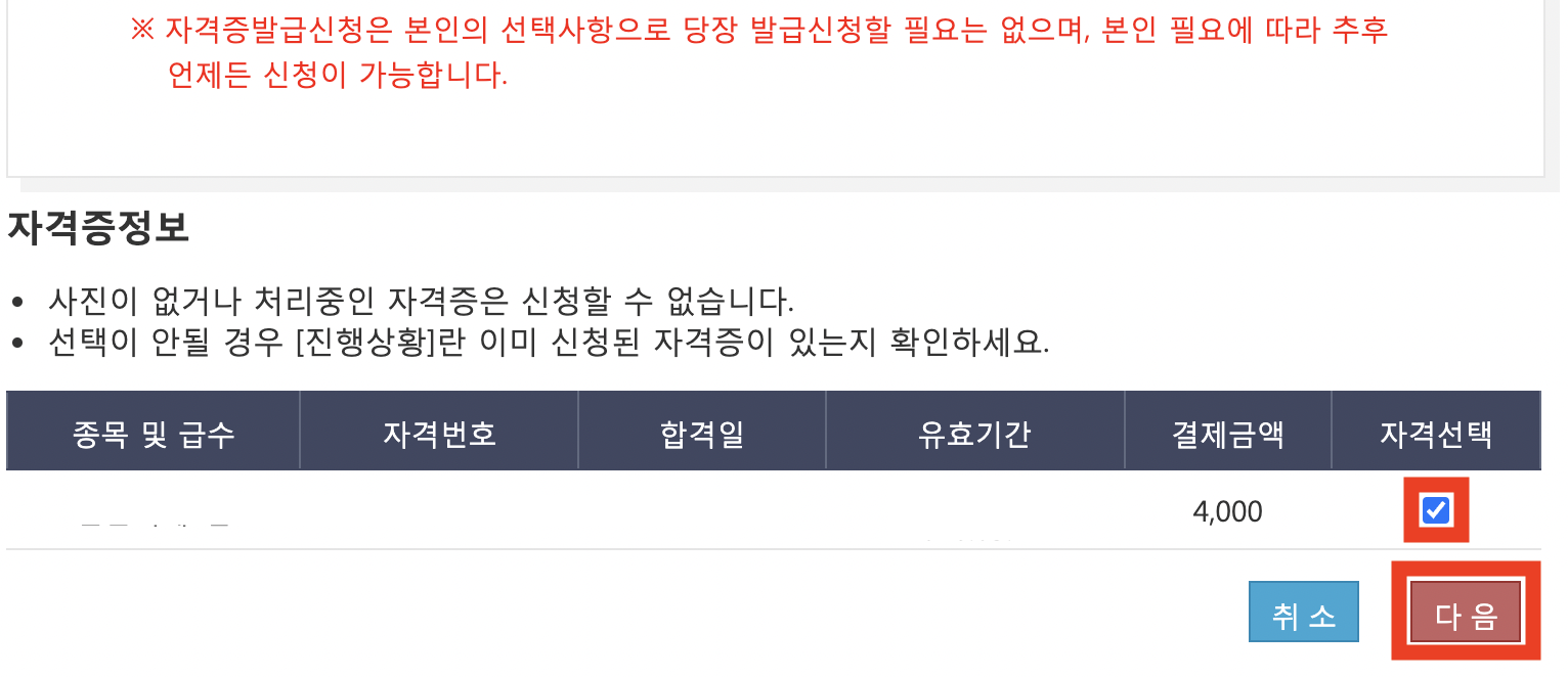 발급 또는 재발급 받을 자격증에 체크한 후 다음을 클릭합니다.