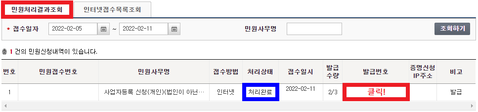 '민원처리결과조회'를 클릭했을 때 처리상태가 '처리완료'로 바뀌어야 합니다. 이 상태에서 발급번호를 클릭하면 사업자등록증을 출력할 수 있습니다.