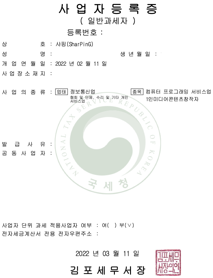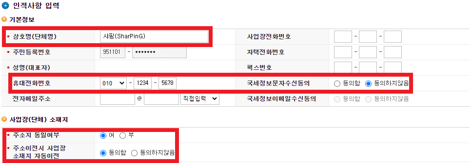 빨강색 별(*)로 표시된 항목에 모두 입력하면 되지만, 몇 가지 유의 사항을 알려주겠습니다. 저처럼 사업 소재지를 따로 두지 않았다면, 휴대전화번호를 입력하고 국세정보문자수신동의에 체크하면 됩니다. 그리고 상호명에는 반드시 한글이 들어가야 하고, 영문이라면 한글과 영문을 같이 표기해야 합니다. 저는 '샤핑(SharPinG)'이라고 입력하였습니다.