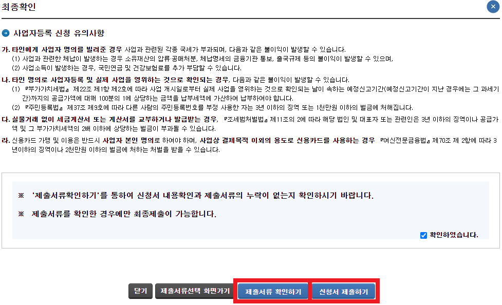 '제출서류 확인하기'를 클릭해서 오탈자가 없는지 확인한 후 '신청서 제출하기'를 클릭합니다.