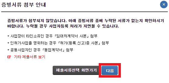 저처럼 사업 소재지를 따로 두지 않았다면, 파일 첨부 없이 '다음'을 클릭하면 됩니다. 그러나, 사업 소재지가 있다면 임대차계약서 등을 첨부해야 할 것 같습니다.
