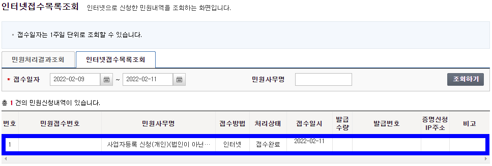 인터넷접수목록조회에서 보면 사업자등록이 신청된 것을 볼 수 있습니다. 이제 담당자가 승인해주면 사업자 등록이 완료됩니다. '민원처리결과조회'를 클릭하면 승인 여부를 확인할 수 있습니다.