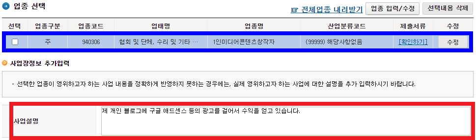 업종명으로 '1인미디어콘텐츠창작자'가 등록된 것을 볼 수 있습니다. 이제 사업설명 칸에 입력합니다. 저는 블로거이므로 위와 같이 입력하였습니다.