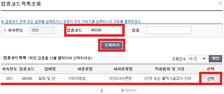 저는 블로거이므로 '1인미디어콘텐츠창작자'로 등록해야 합니다. 그러므로, 업종코드에 '940306'이라고 입력하고 '조회하기'를 클릭한 후 '선택'을 클릭합니다.