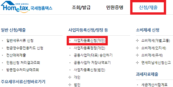 [신청/제출]-[사업자등록신청(개인)] 을 클릭합니다.