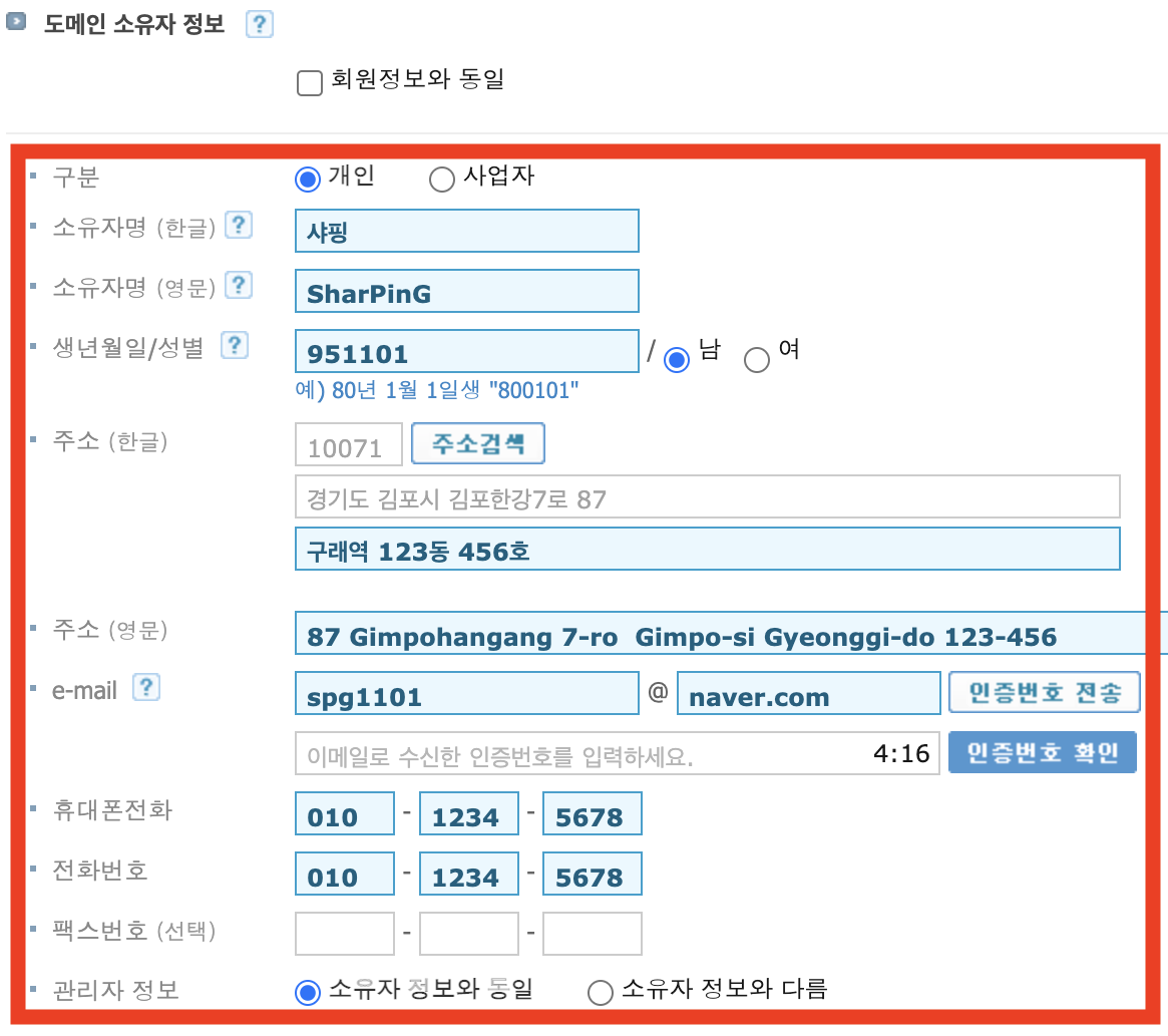 밑으로 내려가서 도메인 소유자 정보에 팩스번호만 제외하고 모든 항목을 입력합니다.