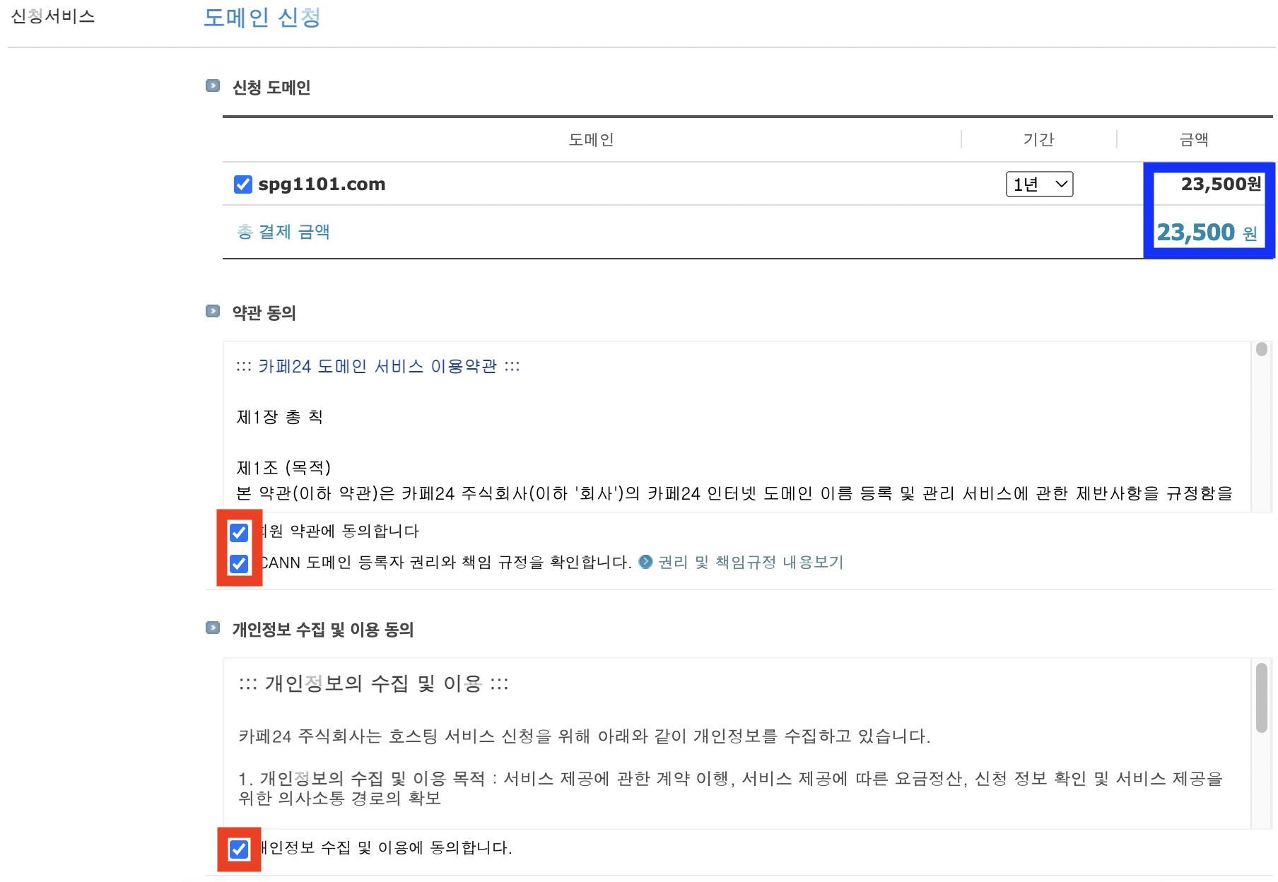가격을 확인한 다음 동의 항목에 모두 체크합니다.
