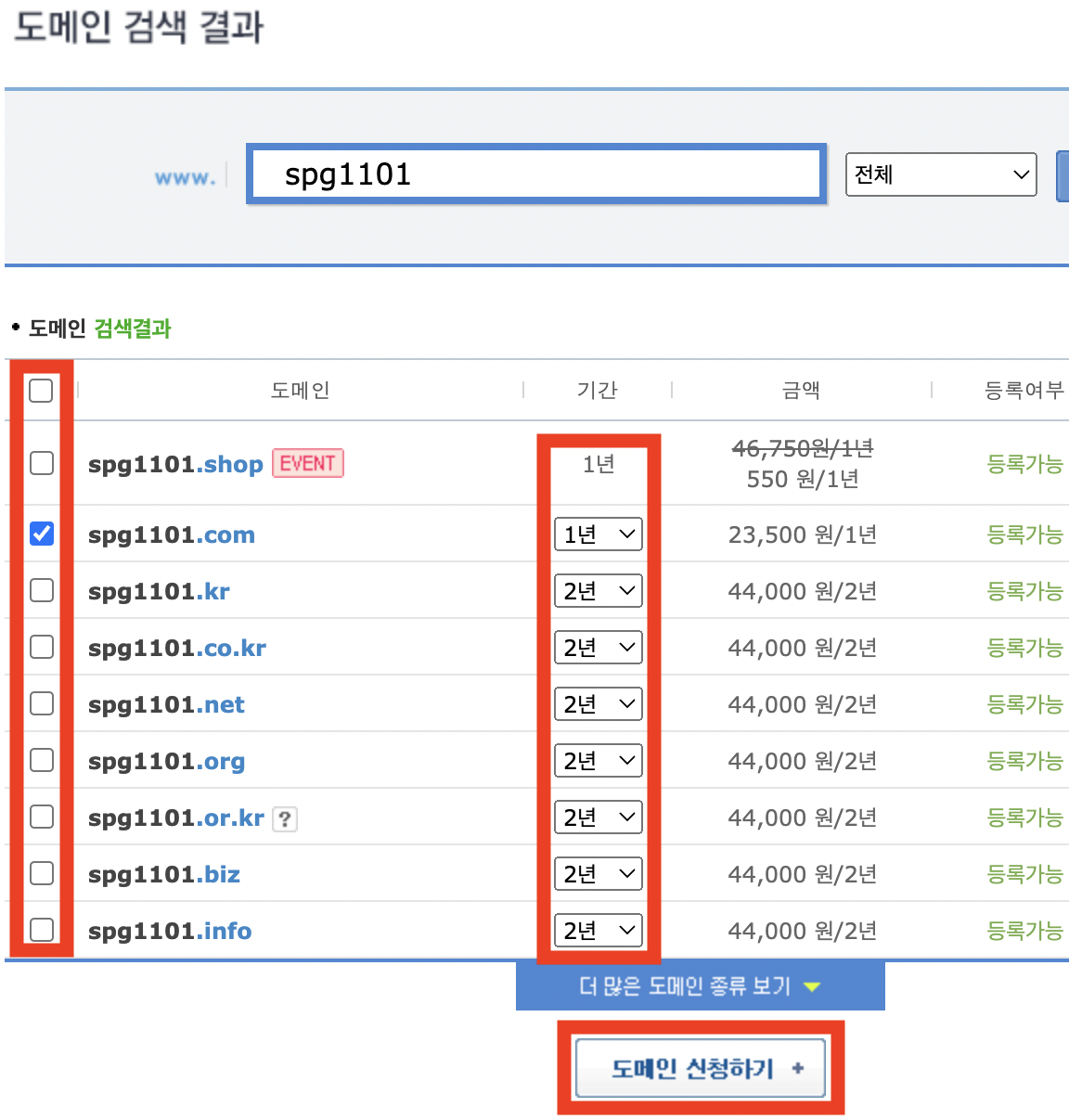 등록 가능한지 확인하고 사용할 도메인에 체크하고 기간을 선택한 다음 도메인 신청하기를 클릭합니다.