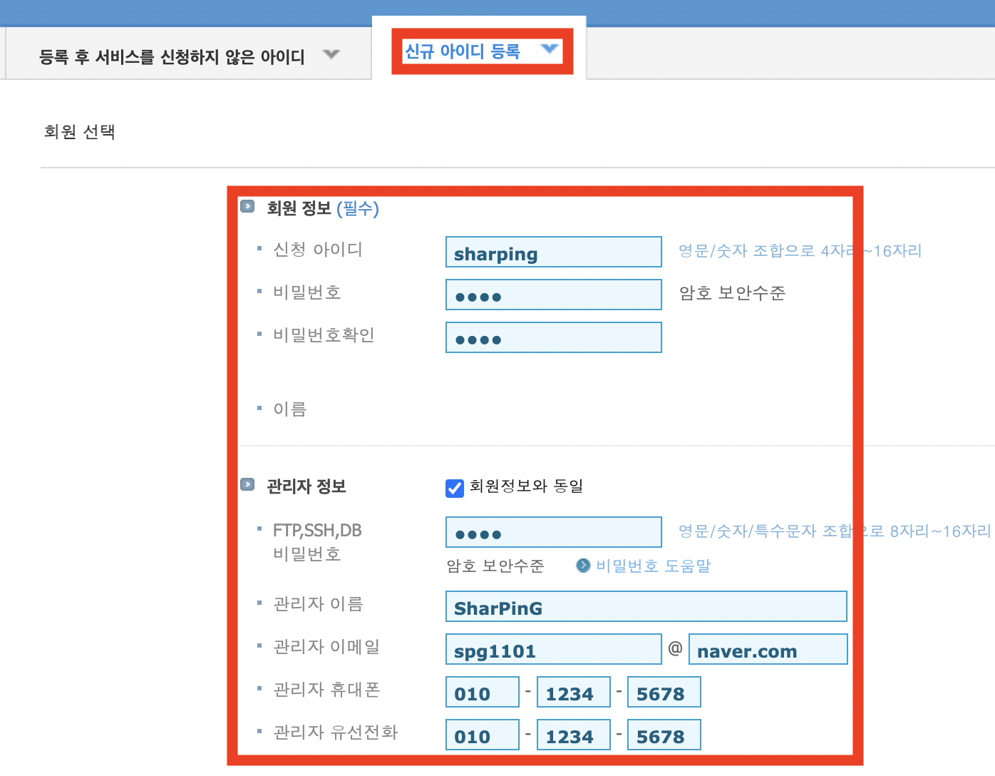 신규 아이디 등록을 클릭하고 회원 정보와 관리자 정보를 모두 입력합니다. 만약 회원과 관리자가 서로 동일하다면 '회원정보와 동일'에 체크합니다.
