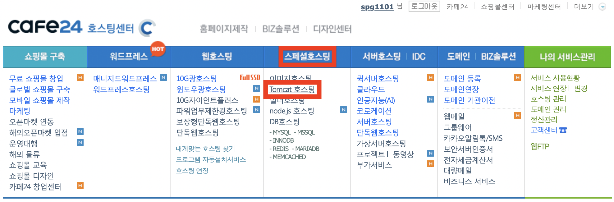 [스페셜호스팅]-[Tomcat 호스팅] 을 클릭합니다.
