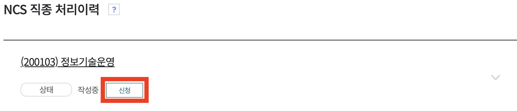 밑으로 내려가서 NCS 직종 처리이력을 보면, 전에 선택한 '정보기술운영'이 보입니다. 밑의 신청을 클릭합니다.