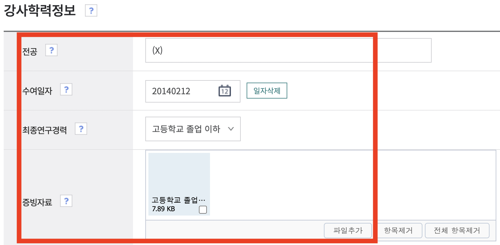 밑으로 내려가서 강사학력정보에서 내 학력 사항을 입력하고 졸업증명서를 첨부합니다. 이때 기준은 '최종적으로 졸업한 학교'입니다. 가령, 대학생이라면 아직 고졸이므로 '고등학교 졸업 이하'를 선택합니다. 그리고, 반드시 졸업증명서를 첨부해야 하고, 졸업예정증명서는 안 됩니다.
