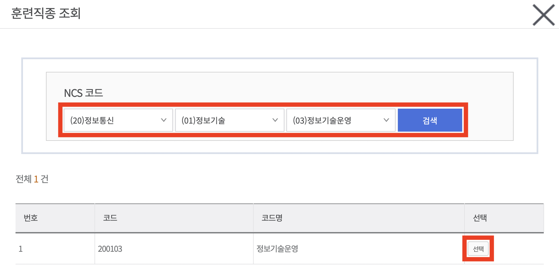 NCS 코드에서 카테고리를 선택하고 검색을 클릭한 다음 원하는 항목을 선택합니다. 저는 '정보기술운영'을 선택하겠습니다.
