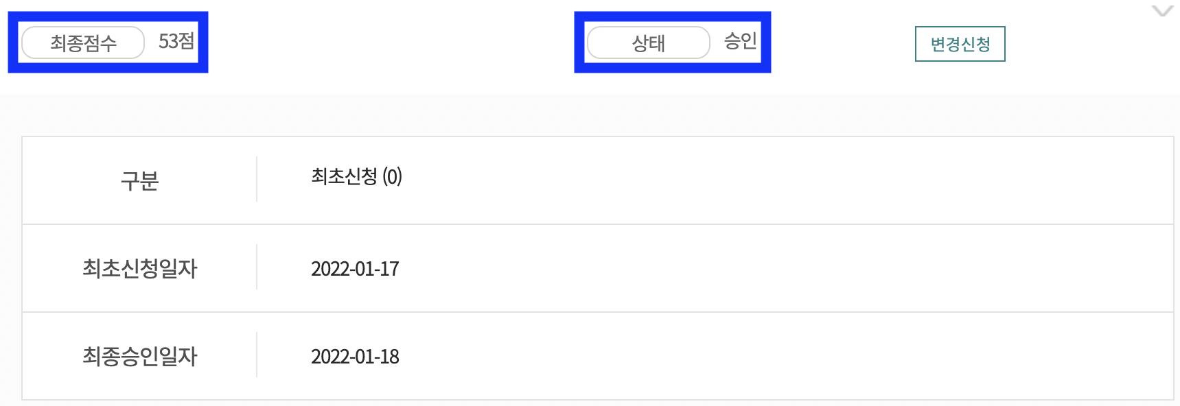 상태가 '승인'으로 바뀌면 정상 처리 된 것입니다. 왼쪽에 최종 점수도 같이 뜨는데, '고졸(or 대학 재학중) + 기사 자격증 보유'이면 53점 나옵니다.