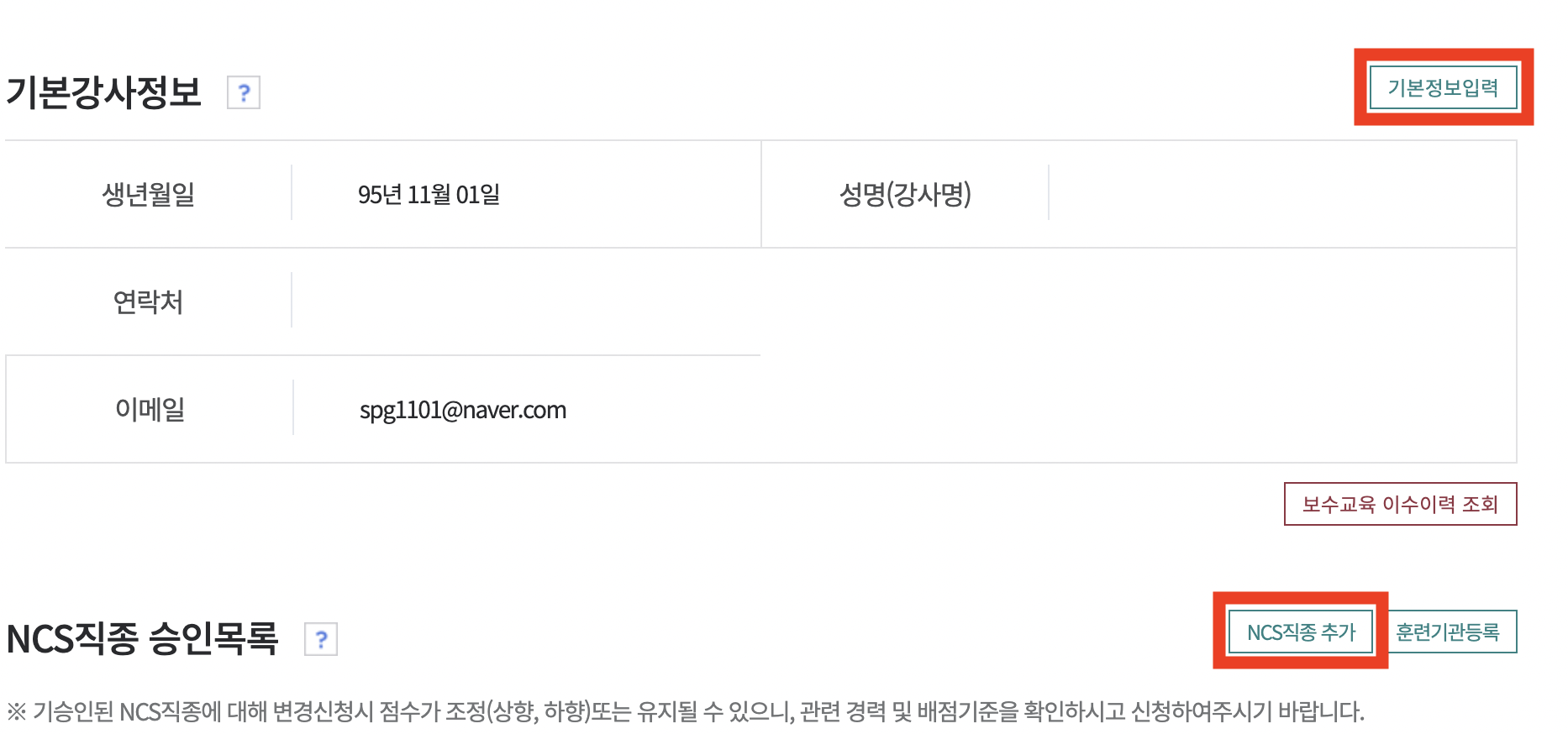 밑으로 내려가서 기본강사정보에서 '기본정보입력'을 클릭해서 내 정보를 입력합니다. 그다음, NCS직종 승인목록에서 'NCS직종 추가'를 클릭합니다.