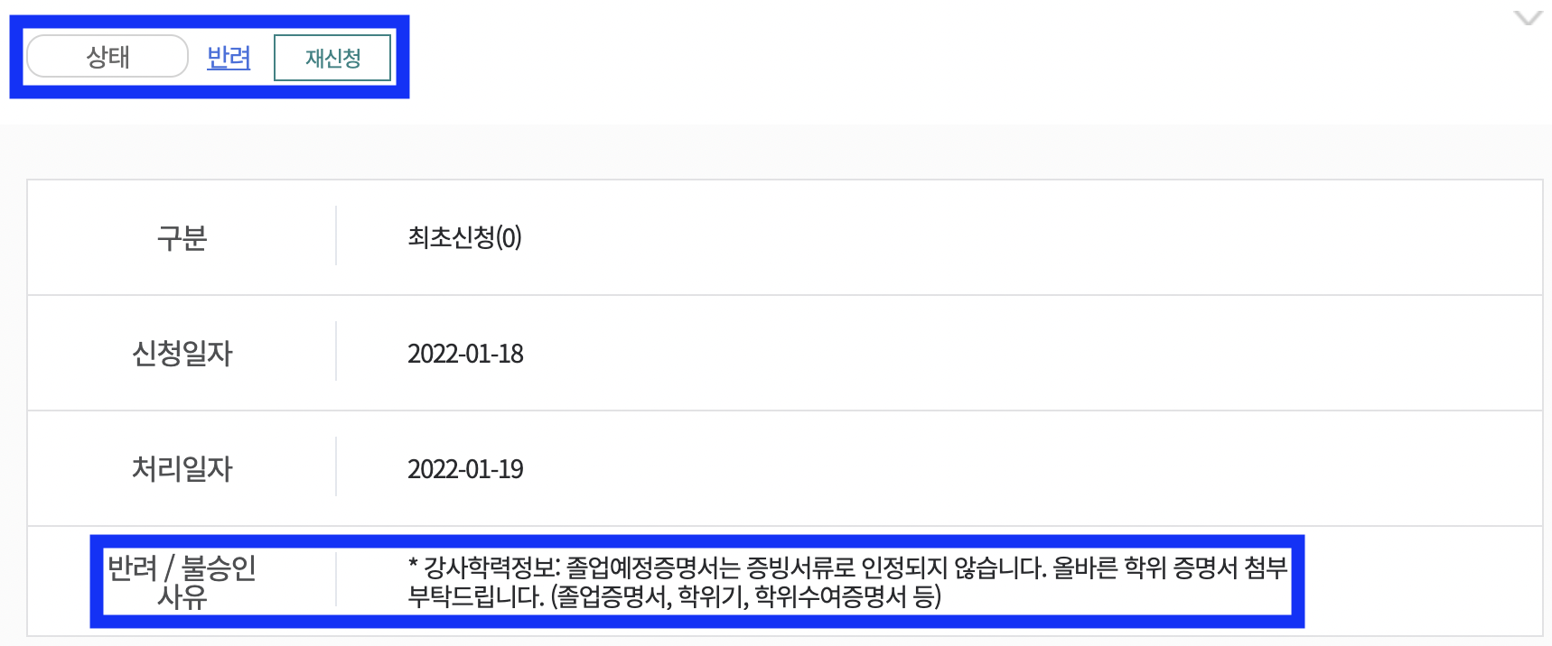 만약 상태가 '반려'로 바뀌면 반려/불승인 사유에 왜 승인이 안 되었는지 뜹니다. 이러한 경우 재신청을 클릭해서 하라는 대로 해서 다시 신청하면 됩니다. 전에 언급한 대로, 졸업예정증명서는 인정이 안 되는 것을 볼 수 있습니다.