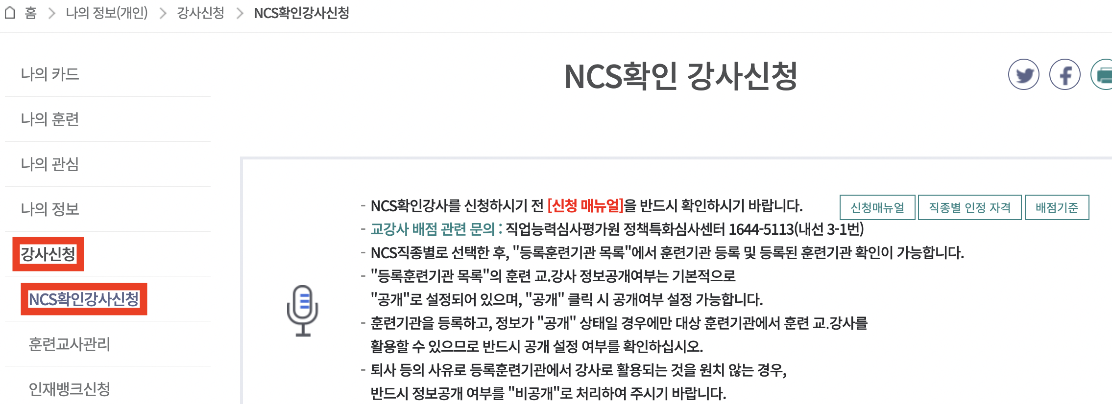 [강사신청]-[NCS확인강사신청]을 클릭합니다.