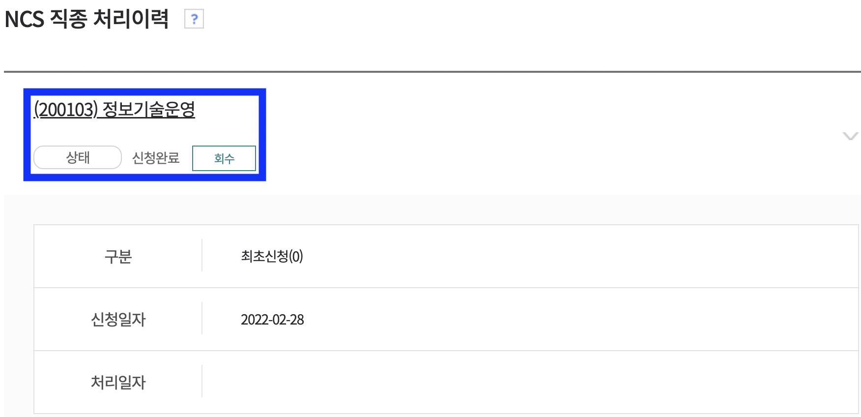 밑으로 내려가서 NCS 직종 처리이력을 보면, 전에 선택한 '정보기술운영'이 보입니다. 밑의 신청을 클릭합니다.